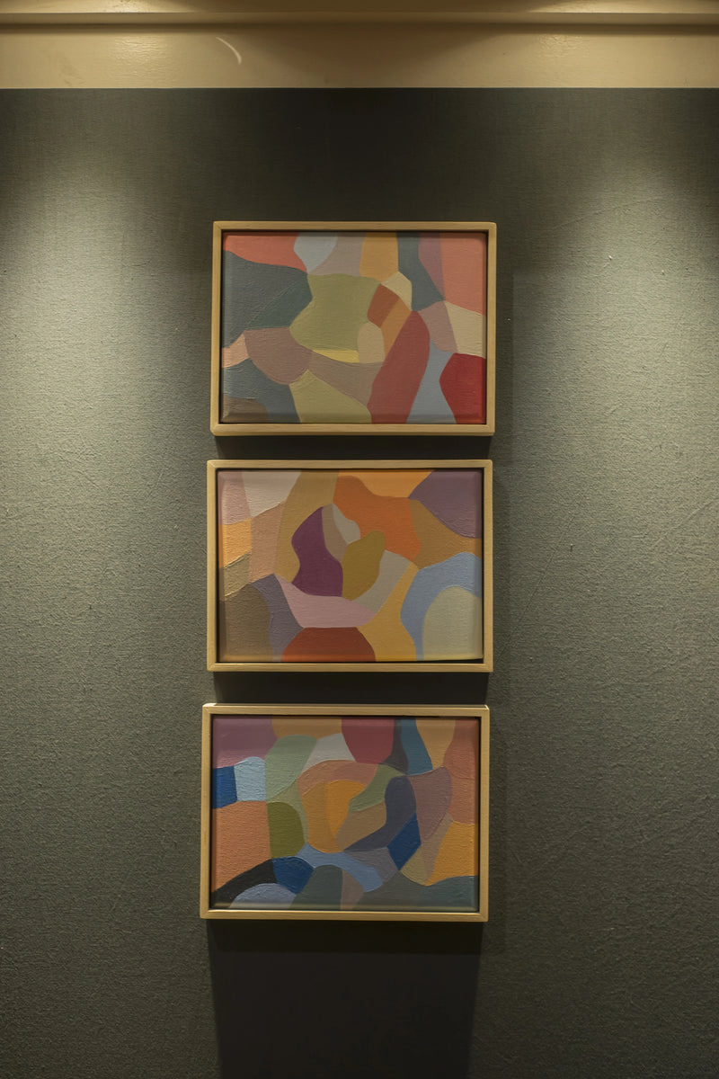 This series of oil-painted abstractions brings us closer—in a veiled and poetic manner—to the artist’s introspective universe, expressed through a chromatic key. The movements of color condense into organic shapes that take on qualities of either weightless lightness or concrete planes. Figures appear suspended, coupled together, or adrift in a smooth, soundless magma. They are pieces of a whole, demarcations of an imaginary map where each color governs itself by its own laws. Florencia invites us to contemplate, to surrender to the sensory weight, and to lose ourselves in its joyful collateral effects.